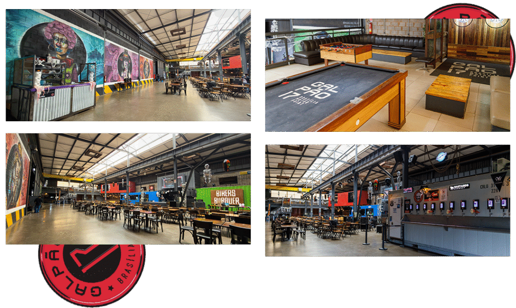 Alugue o galpão inteiro para shows, aniversários, confraternizações e eventos corporativos. Palco com iluminação, som de qualidade, área ampla com espaço externo, autoatendimento de chopp e jogos que a galera ama.